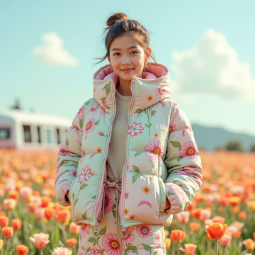 这幅作品展示了一位拥有粉色卷发的小女孩,背景是蓝天、白云、太阳和几棵树木。主要元素包括小女孩的笑脸、