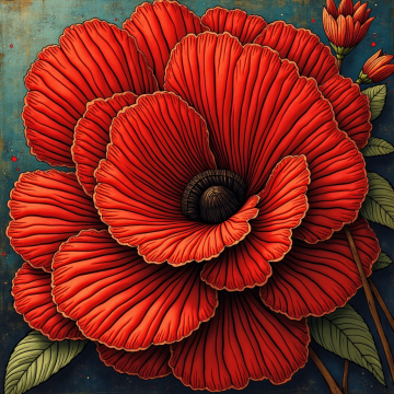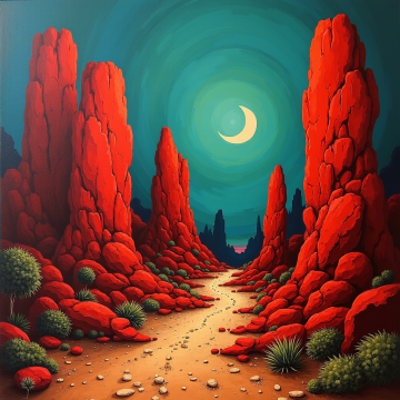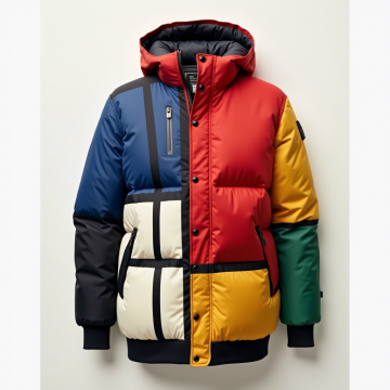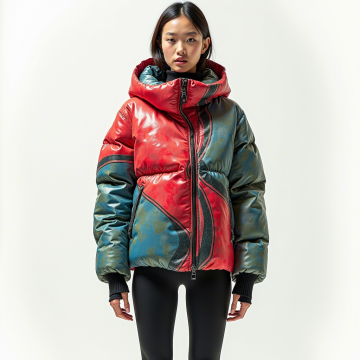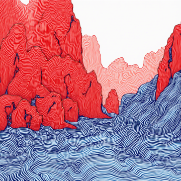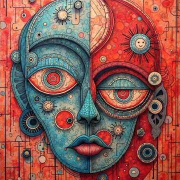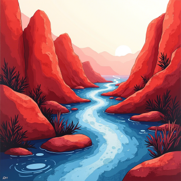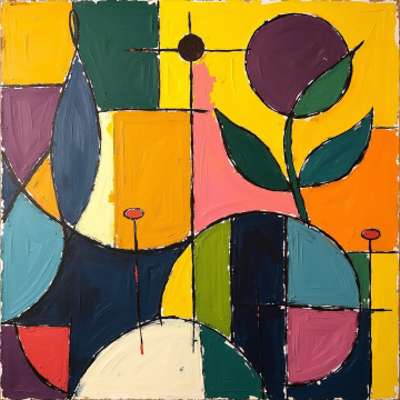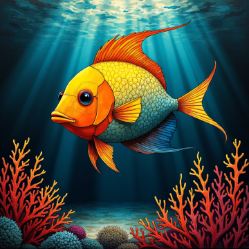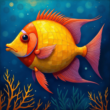 这幅作品展示了一条色彩斑斓的鱼在水下环境中游动。主要元素包括鱼的身体、鲜艳的颜色(黄色、蓝色和红色)