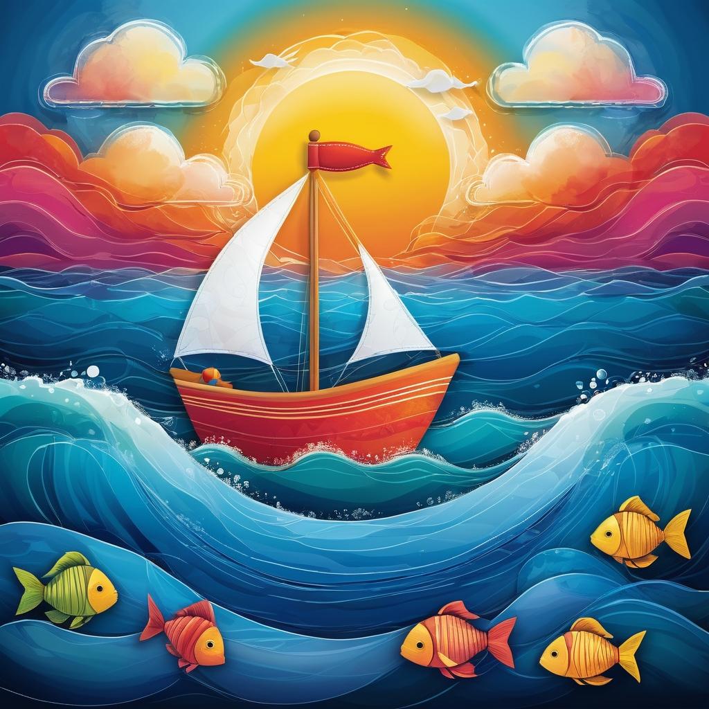 這幅畫作呈現了一種純真和簡約的美感,透過鮮明的色彩搭配和簡單的圖案元素,成功地展現了兒童對自然和航海的想像。可以考慮加入更多的細節,例如不同種類的魚或是多樣的雲層形狀,以增添畫面的豐富性。此外,背景的處理可以更具層次感,運用漸變色或是陰影來增強空間的深度和立體感,使作品更具藝術性和吸引力。