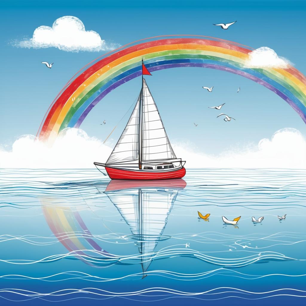 這幅作品以其簡單而富有童趣的表現形式而引人注目。彩虹色的運用讓畫面充滿了生機和活力,喚起了一種無憂無慮的童年回憶。為了讓作品更具深度,可以考慮增加背景元素,如波浪或天空,以強化帆船在水上航行的場景。此外,可以嘗試加入一些細節,比如船上的小旗子或海鳥,這將使畫面更豐富且富有故事性。這樣的提升會使作品更具藝術性和吸引力,尤其在兒童藝術教育中能激發更多的想像力。