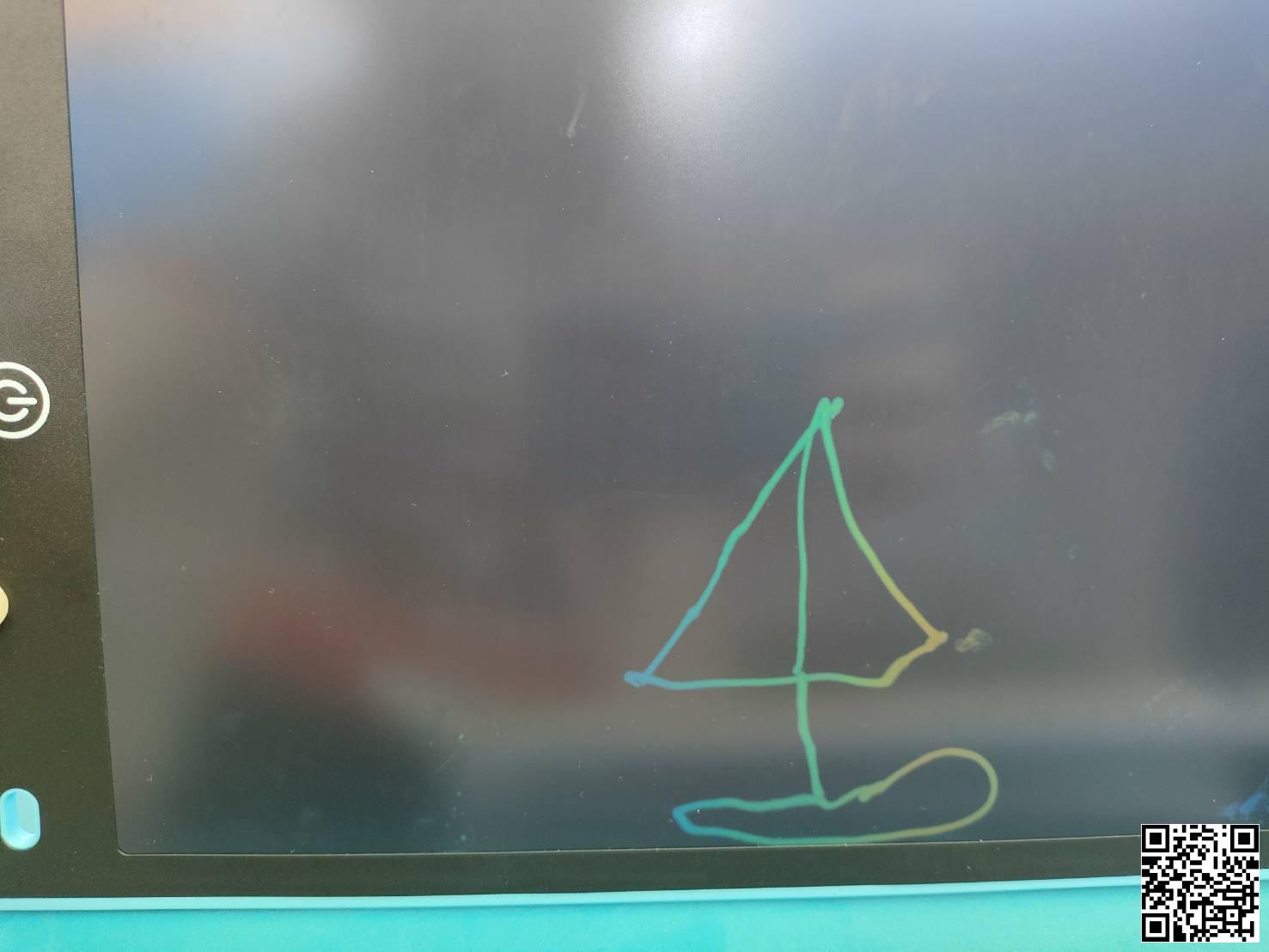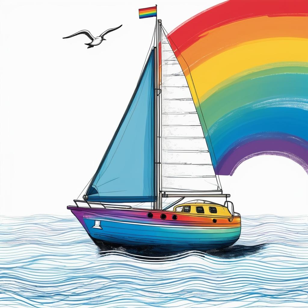 這幅作品是一個簡單的線條畫,描繪了一艘帆船。整體色調柔和,使用了漸變的彩虹色。構圖簡潔明了,以中心為焦點,表達出一種純粹和童趣的情感。