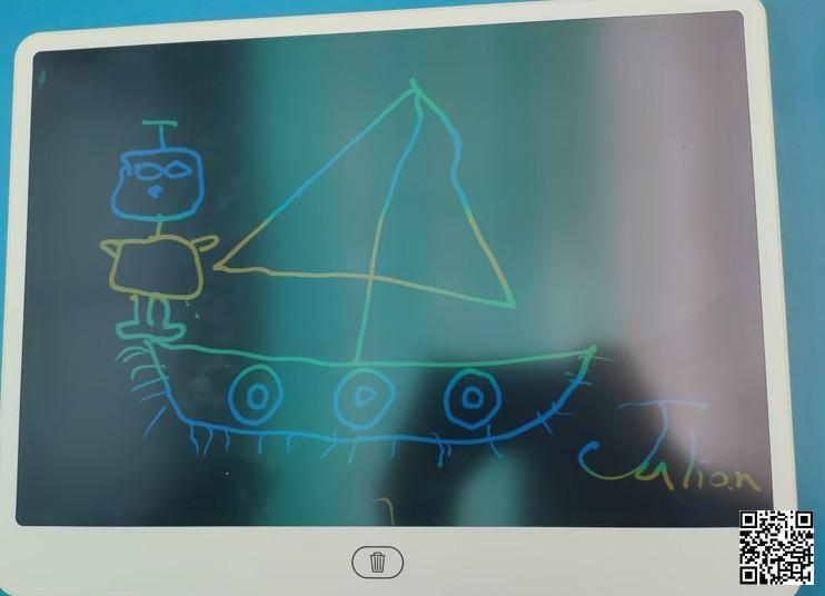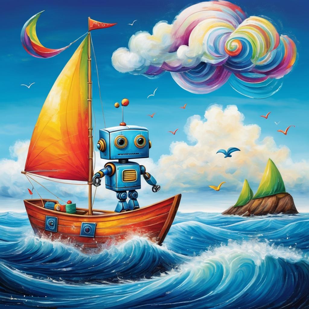 這幅充滿童趣的畫作帶領觀眾進入一個充滿創意和冒險的世界。畫中,孩子用簡單的線條描繪了一艘帆船和一位機械人,這樣的組合不僅展現了孩子們對科技與自然的想像,也傳達了他們對於未知世界的探索精神。帆船象徵著自由與探險,而機械人則代表著現代科技的介入與幫助。這樣的搭配讓作品不僅僅是兒童塗鴉,更是一種對未來的期待與夢想的表達。建議在這幅作品中進一步加入背景細節,如海浪、魚群和天空,這將增強畫面的層次感和生動性,並讓觀眾更容易進入畫中的奇妙世界。使用鮮豔的色彩和豐富的細節,這幅作品將在任何兒童藝術展覽中脫穎而出,成為激發其他孩子創作靈感的範本。
