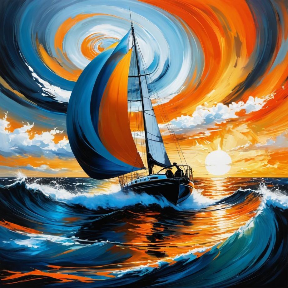 這幅畫面以簡約的線條勾勒出一艘航行在波浪上的帆船,背景呈現出旋轉的漩渦雲朵,色彩上採用了黑色和橙色的對比。整體構圖給人一種動感和流動感,似乎在傳達一種旅程或探索的主題。
