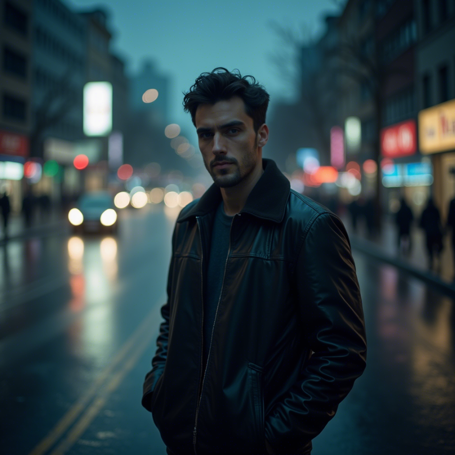 这幅作品展示了一位身穿黑色皮夹克的男子站在雨中的城市街道上。画面中主要元素包括湿漉漉的街道、反射的灯
