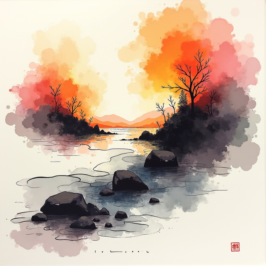請根據圖像特徵給出不少于200字的創作提升建議:在禪意水墨創作中,可以借鑑這幅作品中的色彩運用和線條處理,將其轉化為更為柔和和自然的表現形式。例如,可以使用淡雅的墨色來替代鮮豔的顏色,通過細膩的筆觸來表現線條的流動感。同時,可以引入更多的留白,讓觀者有更多的想象空間。在構圖上,可以參考這幅作品的層次感,但要避免過於複雜,保持簡潔明瞭。此外,可以結合Edvard Munch風格中的情感表達,將內心的情感融入到禪意水墨中,使作品更具感染力和深度。最後,可以嘗試將現代抽象元素與傳統水墨技法相融合,創造出獨特的藝術語言。