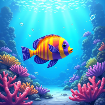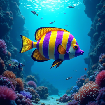 这幅作品展示了一条色彩斑斓的热带鱼,背景是深蓝色的海底世界。鱼的身体呈现出鲜艳的黄色、橙色和紫色条纹