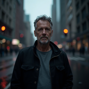Comment on 这幅作品展示了一位中年男子站在城市街道上,背景是模糊的城市景象和交通信号灯。主要元素包括男子的面部表