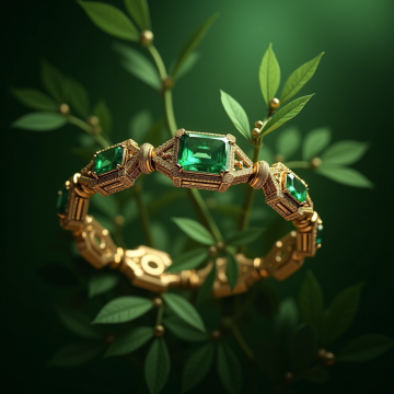 这幅作品展示了一只精美的手镯,主要元素包括绿色的宝石、金色的金属框架和复杂的几何图案。颜色上,绿色与